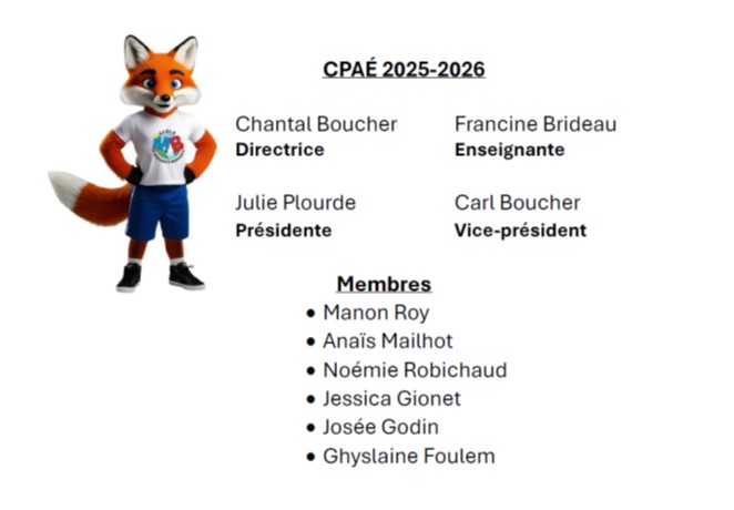 Le comité parental d’appui à l’école (CPAÉ) a un rôle consultatif auprès de la direction de l’école. Il traite de questions générales ayant trait à l’éducation de l’ensemble des élèves qui fréquentent l’école, dans le but d’améliorer leur apprentissage dans un respect en partageant des recommandations.